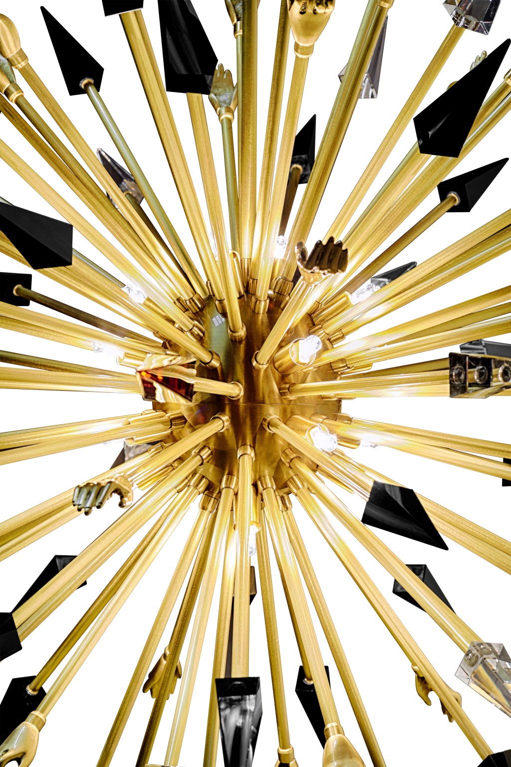 Inspired by the raw intensity of an emotional release, the Outburst Chandelier captures a moment of tension transformed into brilliance. A constellation of elongated brass rays erupts from a dark central core, piercing outward with deliberate force. Interspersed among them, hand-cut glass shards in clear, smoked, and rich amber tones refract light in unpredictable, mesmerizing ways.